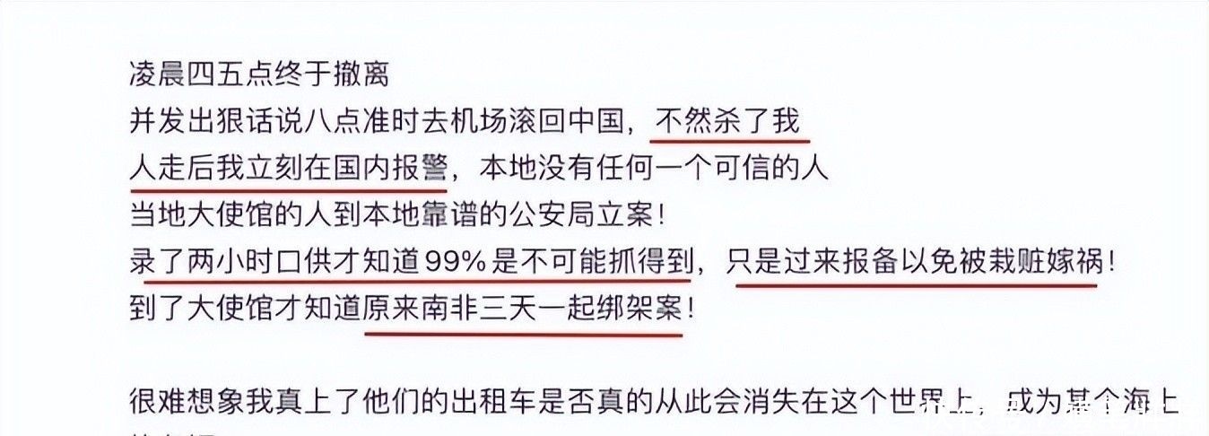 3. 12月8日深夜,刚刚返程回国的他首次公开了在南非旅行期间遭遇的“至暗时刻”:利刃抵颈逼迫转账、采集生物样本伪造罪证……